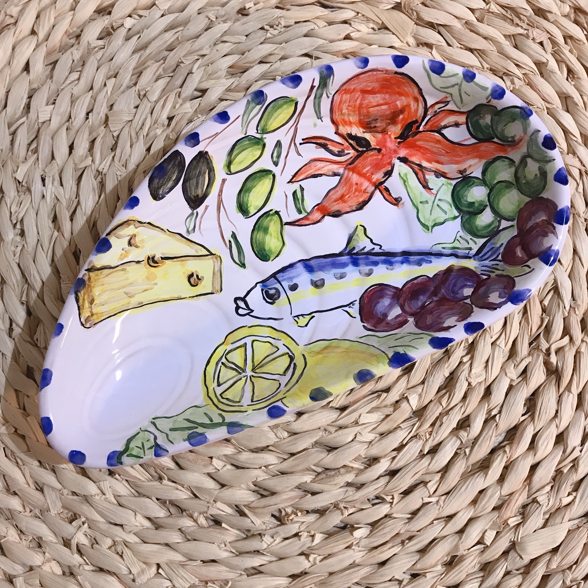 みずみずしいフルーツやシーフードの様子を手描きの温かみを残しながら、細かく絵付けしましたよ。