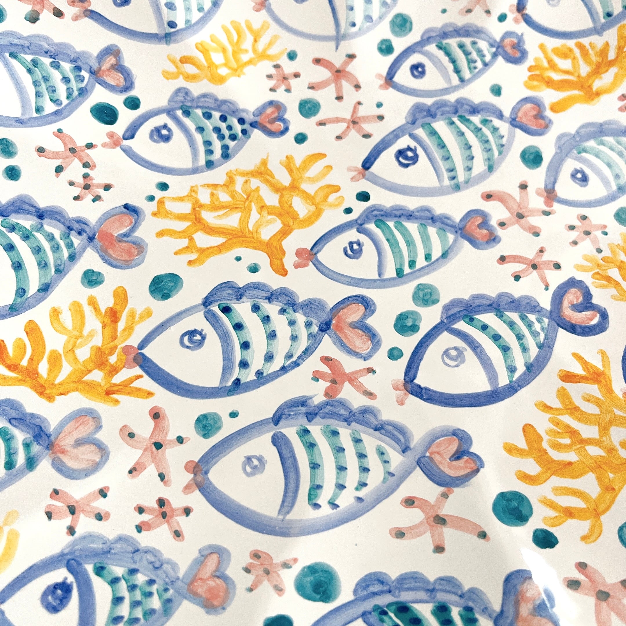 優雅に泳ぐかわいいお魚たちを一面に描きました。少しずつ表情も違うユニークなお魚たちはパーティーなどの華やかな場面でも注目間違いなし。
