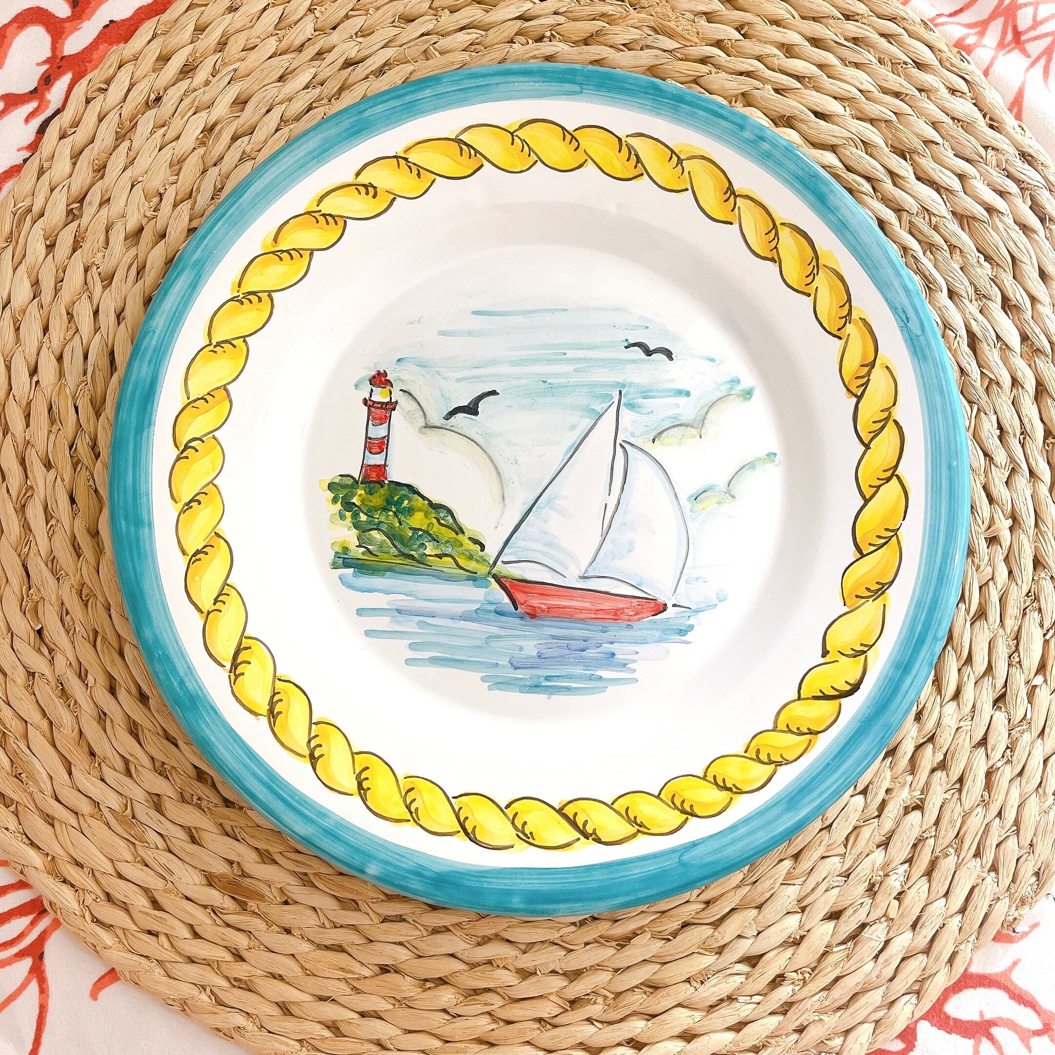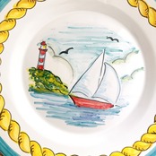 マヨリカ焼き 丸皿(大) ヨットと灯台の風景