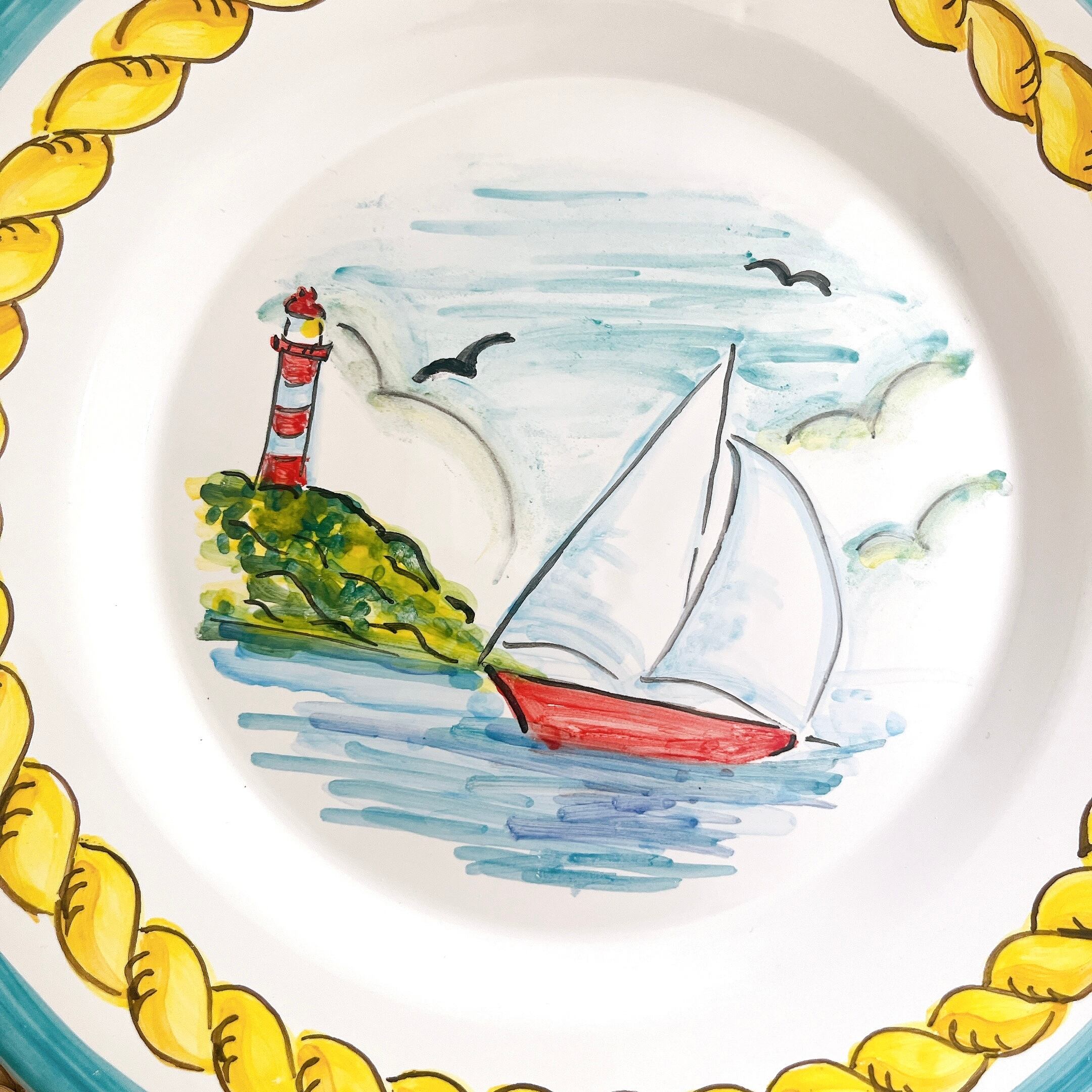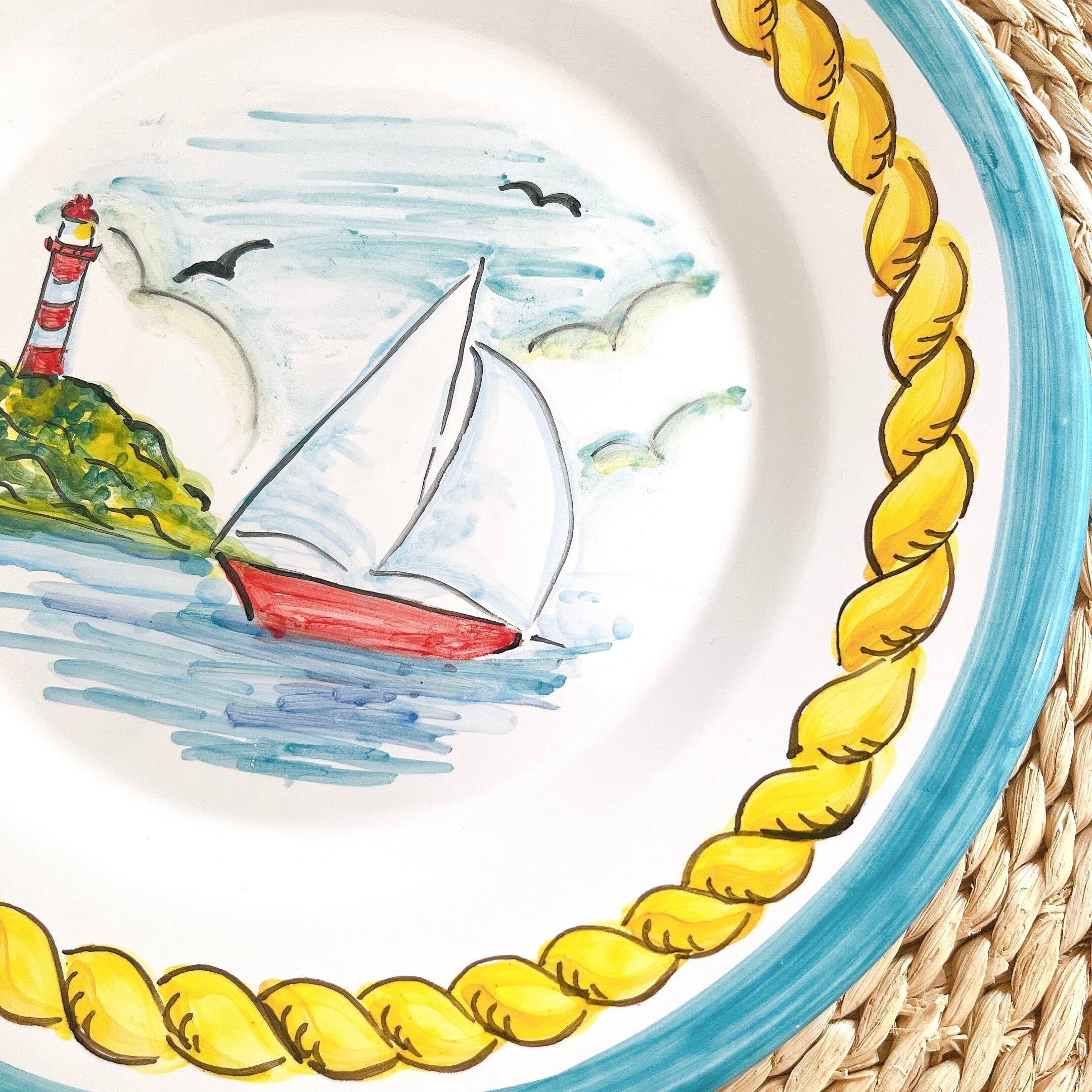 まるで海辺の風景を切り取ったかのようなヨットと灯台の絵付け。